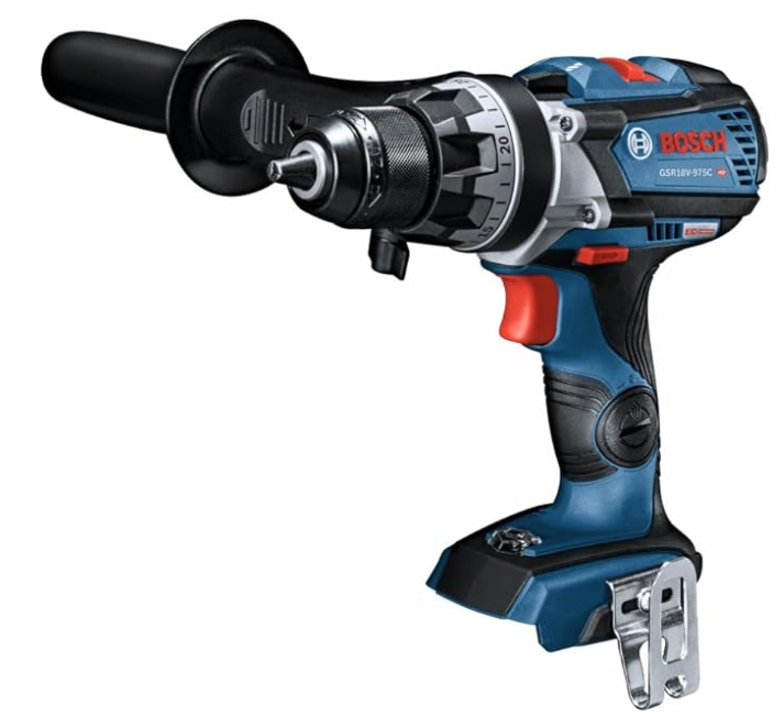 The Bosch GSR18V‑975CN is a professional 18-volt brushless drill/driver built for demanding tasks in construction, woodworking or general trades. It delivers up to 975 inch‑pounds (in‑lb) of torque in direct drive mode. The tool features two speed ranges: a high-speed mode up to about 2,100 RPM and a high-power mode up to approximately 480 RPM, lending it flexibility between fast drilling and torque-heavy driving. It is equipped with a 25‑setting precision clutch, which helps in controlling tight screws and prevents overdriving or damaging workpieces. The device includes Bosch’s KickBack Control, a safety feature that detects sudden binding and attempts to reduce torque reaction.